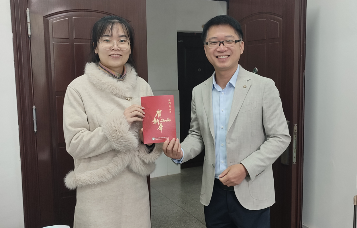 2024年1月18日,在癸卯年腊月初八当天,电子信息公司领导党委书记张婧,党委副书记、经理罗丽平,党委副书记、纪委书记罗少科,副经理文春明、卢振坤深入各教研室、办公室、实验室慰问全院50位教职员工,并送上了精心制作的感谢信,也送上了2024甲辰龙年的美好祝福。