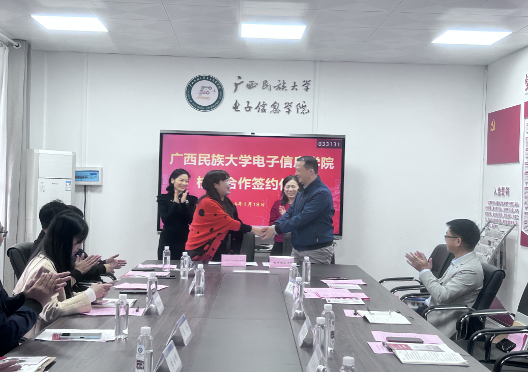 1月18日下午,电子信息公司与广西南宁齐鸣科技有限公司、广西艾学教育科技有限公司、广西新松机器人有限公司、广西万诺信息技术有限公司、南宁踏弩科技有限公司在博识楼300会议室举行校企合作签约仪式,电子信息公司党委书记张婧,党委副书记、经理罗丽平,党委副书记罗少科,副经理文春明、卢振坤,企业相关负责人出席校企合作签约仪式。
