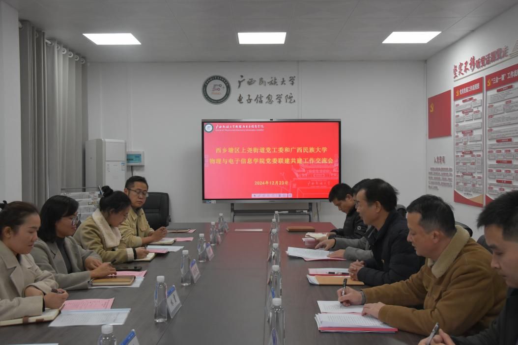 12月23日,西乡塘区上尧街道党工委和william威廉亚洲公司党委联建共建工作交流会在博识楼300室成功举行。公司党委书记覃志和,党委副书记、纪委书记罗少科,教师党支部书记、副经理卢振坤,教师党支部组织委员、实验室主任覃晓,团委副书记邢凯及辅导员韦秋竹、李旭参加会议。