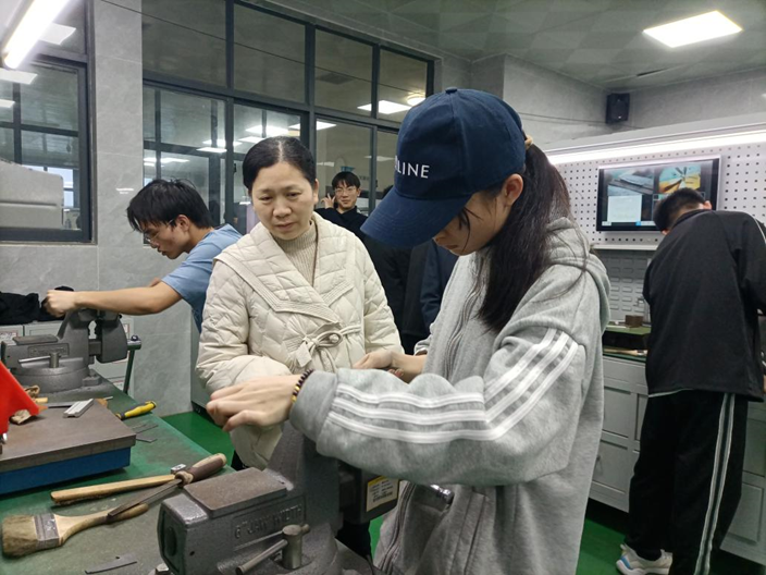 在广西机电职业技术公司工程实训公司领导带领下,公司领导和老师一行在普通机床操作技能实训车间,观看员工加工锤头和锤柄;在钳工实训室观看员工打磨铁片,与员工、指导老师进行交流。罗丽平代表公司向工程实训公司表示感谢,勉励同学们要把握好金工实习机会,在指导老师的帮助下,进一步提高动手能力和工程实践能力,展现电院学子“敏行致新”良好风貌。