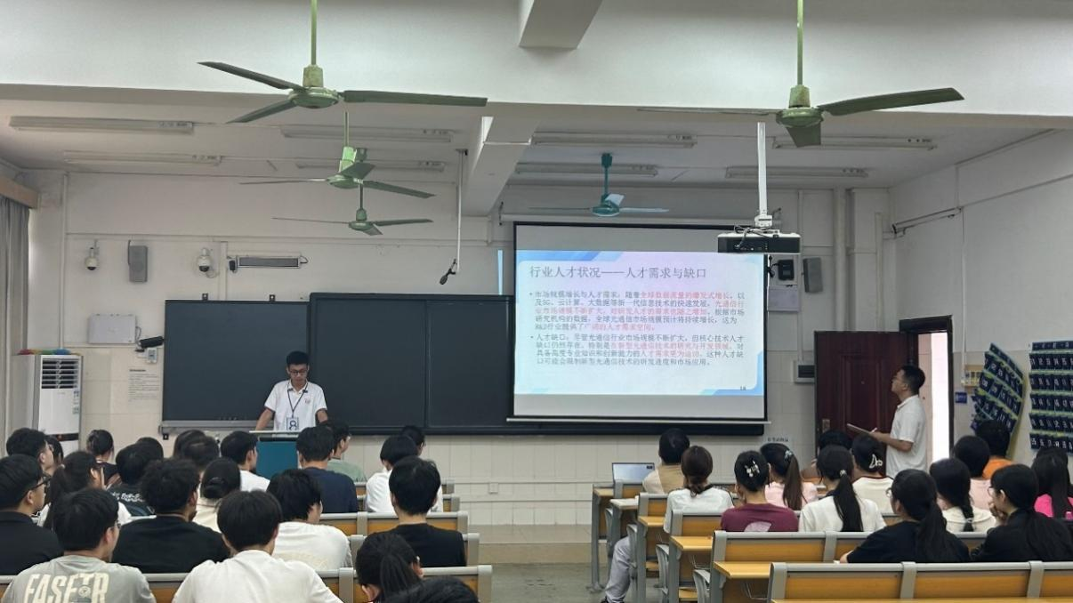 本次翻转课堂主讲人是通信工程系王黎明老师,课程是《光纤通信》,主要内容是“光通信新技术”。课堂教学设计是:由老师讲解上课流程以及评分规则,员工围绕光孤子通信、量子通信等光通信新技术进行陈述,然后由员工分组讨论,互动提问,全程由任课老师引导讨论的范围,总结讨论结果。